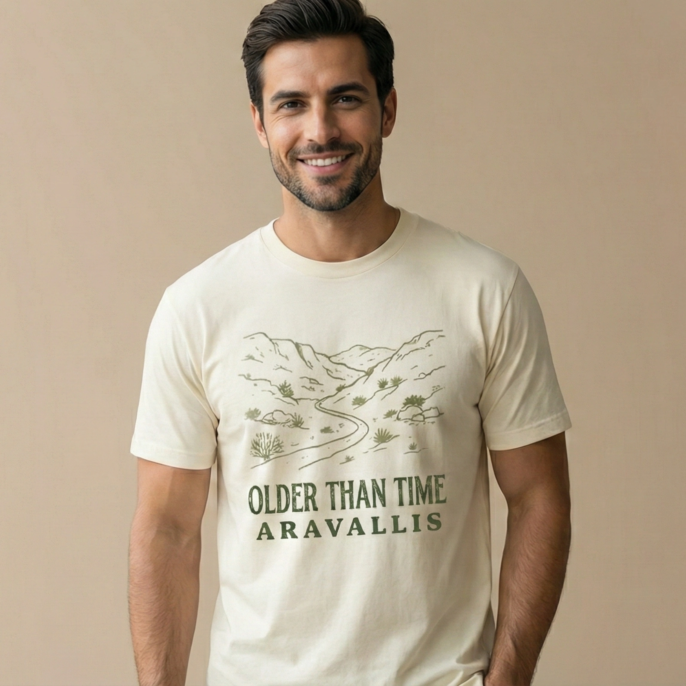 Designed for men who appreciate subtle design and thoughtful graphics, this t-shirt features a finely detailed Aravalli landscape illustration paired with the bold statement “Older Than Time – Aravallis.” It’s not just a tee—it’s a conversation starter.